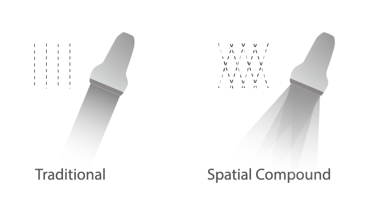 TheSpatial Compound Imaging sử dụng một số đường ngắm để có độ phân giải tương phản tối ưu, giảm đốm sáng và phát hiện đường viền, trong đó P25 lý tưởng để chụp ảnh bề mặt và vùng bụng với độ rõ nét hơn và cải thiện tính liên tục của cấu trúc.