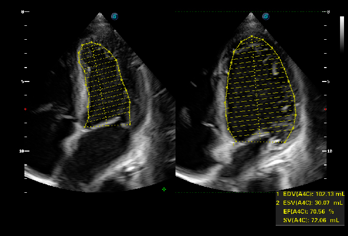 Để nhận biết mật độ cơ tim trong thời kỳ tâm trương và tâm thu và tự động tính toán phân suất tống máu.