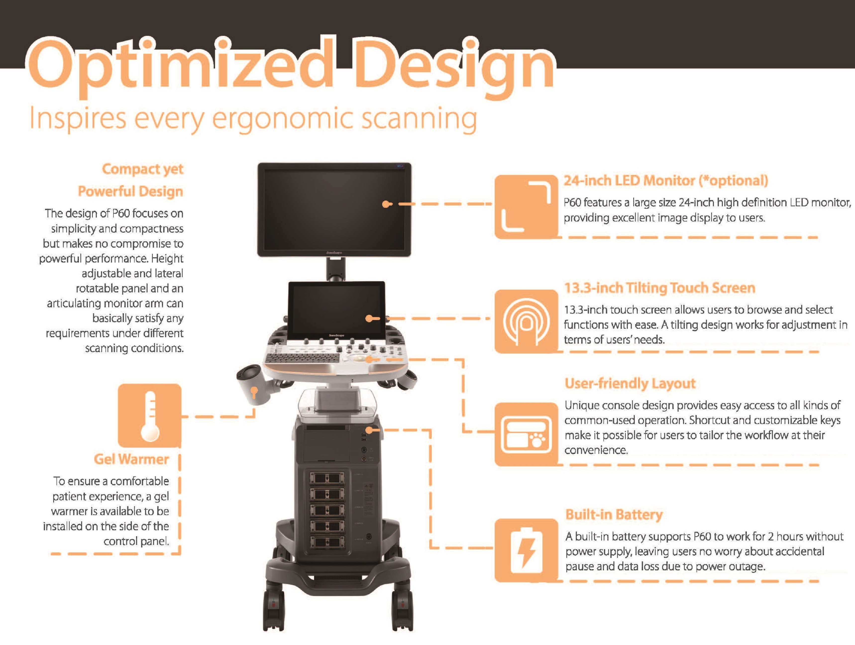 Thiết kế của P60 đề cao sự đơn giản và nhỏ gọn nhưng không ảnh hưởng đến hiệu suất mạnh mẽ. Có thể điều chỉnh độ cao và bảng điều khiển có thể xoay bên và một tay màn hình khớp nối về cơ bản có thể đáp ứng mọi yêu cầu trong các điều kiện quét khác nhau.